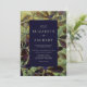 Este convite botânico moderno apresenta um fundo escuro e sangrento de folhas de outono em tons de verde, amarelo e roxo. Personalize-o com os nomes da noiva e noiva e outros detalhes do casamento em amarelo pálido em um retângulo roxo escuro. A imagem das folhas é repetida na parte de trás do cartão. Ideal para um casamento outono!