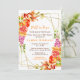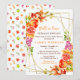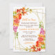 This fun and whimsical baby shower invitation features watercolor pomegranate, apples, grapes, mushrooms and foliage on a gold geometric frame. The text combines handwritten script and serif fonts for a stylish and modern look. This is perfect for a rustic autumn fall baby shower.
