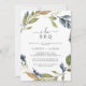 Neste cenário de outono, Eu faço o convite para festa de noivado de CHURRASCO é perfeito para uma festa de noivado de outono, chá de casais, janto de ensaio, após festa ou qualquer evento de casamento. A design moderna rústica apresenta folhas azuis marinhos, verdes-sábios e douradas com espirros de flores azuis escuras.