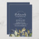 Este convite para o almoço das donas de marinho verde deste outono é perfeito para um evento de outono. A design moderna rústica apresenta folhas azuis marinhos, verdes-sábios e douradas com espirros de flores azuis escuras.