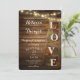 Escada de madeira de safra com letras LOVE decoradas com folhas de carvalho de outono em cores de queda quente neste campo de convite de casamento rústico. Luzes de fio cintilante de Sparkley adicionam charme extra sobre o fundo da madeira do celeiro escuro.