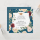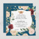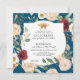 design com cor de água de origem pintada, cor de água, de cor floral de outono, apresentando crimson vermelho crisântemos, rosas de coral e vários elementos foliares e folhas. A cor de fundo na frente é um azul céu quente profundo com uma sugestão de cor turquesa, mas pode ser alterada para corresponder às cores do seu casamento. O verso tem uma xadrez fina de cinzas. Copyright, Audrey Jeanne Roberts.