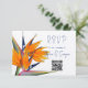 Cartões de resposta de casamento com modelo de código QR. Pássaro laranja das flores do paraíso decoram cartões brancos. Personalize o texto azul escuro e adicione seu código QR pessoal para direcionar convidados ao site do casamento para RSVP para um convite de casamento. O reverso é laranja sólido.