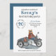 Um filhote de ursos bonitinho espera no carro do pai, pronto para a aventura! Palavras no carro lateral leram "Aventura aguarda". Isso faz um convite de aniversário adorável!
