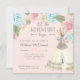 Formato quadrado para um tema de convite de chá de fraldas exclusivo e destacável. Mão pintada em aquarela pela artista e designer Audrey Jeanne Roberts. Rosas azuis e rosadas pastéis com uma fenda e texto tipográfico "que comece a aventura." Copyright, Audrey Jeanne Roberts.
