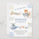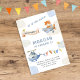 Para cima e para fora! Convide seus pequenos convidados para uma comemoração de alto voo com este belo convite de aniversário para aviões. Com uma raposa voando num avião, um lobo pilotando um helicóptero, pássaros alegres e nuvens de aquarelas moles, esta design combina encantos da floresta com uma aventura na aviação. Personalize o texto para se adequar aos detalhes do seu partido.
