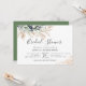 Este Chá de panela Botânico Moderno Verde - apresenta galhos verdes e ouros de oliveiras, gotas de ouro com texto moderno. O reverso do convite à noiva é elegante verde-oliva escuro.