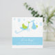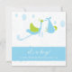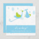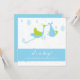 Convites azuis do chá de fraldas da cerceta bonito. Caracterizando uma cegonha que leva um menino. Incorpore seus próprios cumprimentos.