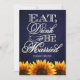 Coma a bebida & seja convites azuis casados do casamento do girassol do quadro---combine os cartões de RSVP e mais encontraram abaixo nesta página. Felicite seu tema do casamento do girassol com estes convites que caracterize uma textura azul do quadro como um fundo com comem, bebida & seja casado no roteiro elegante com os girassóis vibrantes na parte inferior da parte dianteira e da parte traseira de cada convite. Estes convites do casamento são ajustados ao estoque básico de alta qualidade do cartão; contudo, você pode mudar o estoque ao linho, feltro (gravado), reciclado, e diversas máscaras metálicas se você gostaria sob o número 2 (escolhem seus estilo, tamanho & tipo de papel) abaixo da laranja adicionam ao botão do carro. Uma lista dos custos adicionais para um estoque mais extravagante do cartão é indicada igualmente sob essa opção. Cada convite vem com um envelope branco cabido. Cartões wedding de harmonização See RSVP abaixo para terminar a série.