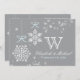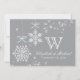 Os convites azuis pálido e cinzentos bonito do casamento do ornamento do floco de neve com coração deram forma a reflexões da neve e a guloseima imprimiu fitas azuis. Estes convidam fazem um convite de casamento temático bonito do Natal ou do inverno. Podem ser personalizados com o monograma do casal, os nomes e a data conhecidos casados do casamento na parte de trás do cartão. © Chrissy H. Estúdio dos trabalhos de arte, LLC. Todos os direitos reservados.