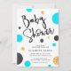 Bolinhas Blue & Dourado Baby Shower convites com "Chá de fraldas" em um guião amigável manuscrito e grande azul-aqua, ouro joalhado e bolinhas pretas flutuando em um design chic e moda. Convites perfeitos para chás de fraldas inteligentes e modernos.