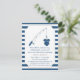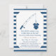 Chá de fraldas temático da pesca elegante, contemporânea e moderna nos azuis marinhos e no cinza. Tem uma haste de pesca que bobina não em um peixe mas amusingly, um bodysuit do bebê com um ícone simples dos peixes. Personalize com seus detalhes do chá de fraldas.