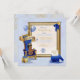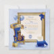 O bebê do vintage na fralda dos azuis marinhos com um ouro jeweled o chocalho da coroa. Está sentando-se em um azul marinho & trono de veludo do ouro com uma bandeira que leia "é um menino!" no brilho dos azuis marinhos do falso com um buquê dos balões amarrados à cadeira. Em seus pés são um ouro & um presente azul. O quadro do ouro embellished com uma fita de azuis marinhos e um rosa amarelo. A informação do registro da loja é encontrada no rolo na caixa no direito inferior. Aperfeiçoe para um anúncio real do chá de fraldas ou do nascimento.
