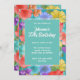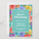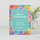Flores de cor-de-água divertidas, brilhantes e multicoloridas pintadas pela Suki. Flores grandes decoram a escrita de pincel de fundo que anota o aniversário no topo do convite de aniversário. Personalize os detalhes do convite de aniversário e aproveite a festa!
