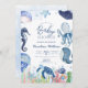 "Um belo convite de chá de fraldas azul-aquarela 'Sob o Mar', com tons de azul suaves e fluentes que evocam a calmaria do oceano. A design está cercada por delicadas tons azuis submarinos, criando uma atmosfera serena e encantadora, perfeita para celebrar a chegada iminente de um pouco