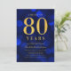Convite de aniversário clássico de 80 com a menção "Saúde até 80 anos" em folha de ouro falsa contra um pano de fundo de padrão azul-safira. O convite tem um fundo azul atrás. Personalize este convite com seus detalhes substituindo o texto do marcador de posição. Para obter mais opções, como alterar a fonte, o tamanho/cor do texto ou o espaçamento entre letras, clique no botão "Personalizar". *Observe que a Marca d'água do Zazzle que aparece na visualização de zoom NÃO aparecerá no produto impresso final. © Rosewood e Citrus