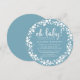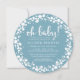 Celebrar um novo bebê a caminho com nossos convites redondos em azul e branco. Design apresenta "oh baby!" em texto de script de estilo manuscrito branco com os detalhes do evento por baixo.