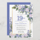 Honre uma mulher especial com este convite de aniversário de 19 anos, elegante e feminino. 19 é escrito em letras grandes e azuis. A celebração de aniversário segue. O nome da convidada de honra também está em letras maiúsculas azuis. O restante do texto é em cinza dove suave. Os detalhes da celebração de aniversário estão rodeados por uma moldura dourada e sofisticada, decorada com rosas brancas e flores azuis. Os elementos florais estão aninhados em folhas verdes escuras. Embora seja um design tradicional, a folhagem botânica aberta e arejada e o texto lhe dão um tom contemporâneo. O verso do convite é azul escuro.