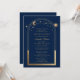 A Astronomia da Lua Solar Dourada Celestial Quinceañera Invisions apresenta um elegante sol dourado, lua e estrelas com um quadro de ouro sobre um fundo azul. Dentro é a sua informação de convite da Quinceañera. Personalize editando o texto nas caixas de texto. Projetado para você pelo Evco Studio www.zazzle.com/store/evcostudio