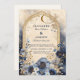 Um design de casamento luxuoso com tema celeste, com um jardim floral azul de meia-noite, sotaque de ouro, e uma lua crescente de ouro enquadrada por um arco de ornamentado. Perfeito para casais que buscam uma celebração romântica, mística e inspirada na noite estelar com detalhes cósmicos elegantes.