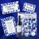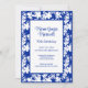 Elegante, design chic com um lindo e moderno padrão floral branco sobre fundo azul. Delicar quadros azuis e fontes elegantes para detalhes e personalização do convite de aniversário.