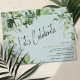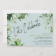 Convites de festas de aniversário casuais e bonitos com plantas tropicais de aquarela num fundo azul pálido. Texto "Comemoração de Vamos" em uma fonte de script com os detalhes do evento no canto inferior direito. Pode ser mudado para qualquer idade.