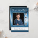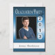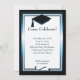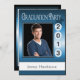 O boné de início está na data de conclusão personalizada. Carregue seu segundo grau ou foto da faculdade e personalize seu nome e data na frente. Preencha os detalhes da festa lá atrás. Mostrada em azul, preto e branco com brilho metálico.