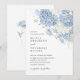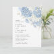 Um design de convite de casamento romântico com flores de hortênsia azul empoeirado, delicadamente pintadas à mão em tons suaves de aquarela.