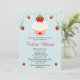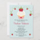Estes chás de panela bonitos e deliciosos do cupcake da morango são perfeitos para um nupcial e um chá de casamento temáticos da morango do verão. Um cupcake amarelo com um coração vermelho e um envoltório cor-de-rosa, um chantiliy, umas morangos, um fundo verde das videiras, o floral e o azul das bolinhas é doce e bonito. © Chrissy H. Estúdio dos trabalhos de arte, LLC. Todos os direitos reservados.