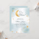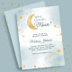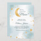 Um doce chá de fraldas com o tema do chá de fraldas "Estamos Sobre a Lua". Este convite tem uma lua brilhante de ouro falso com estrelas correspondentes a um fundo azul e branco de cor d'água.