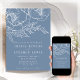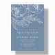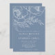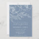 Design de casamento moderno personalizável, com um delicado design floral de linha branca num fundo azul-piscadela com letras brancas elegantes.