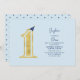 Celebre seu dia especial com este convite de festas moderno do primeiro aniversario. Este design apresenta tipografia dourada "1" com um chapéu de festa bonito. Este convite simples e fofo será perfeito para uma festa de aniversário de um garoto teme azul e dourado.