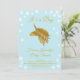 Este convite de chá de fraldas azul claro decorado com um unicórnio de ouro ilustrado, é um Menino escrito em forma de ouro e flocos de neve, fazer perfeito para o chá mágico de bebê de inverno.