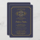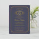 Um elegante rolo de banner e um tom de ouro de quadro redimensionado e um design de convite de festa de formatura azul que pode ser personalizado para graduações de segundo grau, faculdade, universidade ou escola profissional. Design por Holiday Hearts Design (todos os direitos reservados).