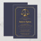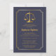 Uma camada legal de ouro de justiça e um tom de ouro de quadro redimensionado e design de convite de festa de formatura azul que pode ser personalizado para graduações de direito ou outras de campo legal. Design composto por Holiday Hearts Design (direitos reservados).