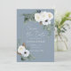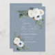 Este belo casamento salva a data do convite design apresenta flores brancas e azuis, eucalipto e pínus, contra um fundo azul empoeirado. "Salvar a data" é gravado na parte superior em letras grandes. Personalize os detalhes para atender às suas necessidades e não se esqueça de mudar as iniciais na parte de trás da noiva e do noivo!