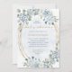 Este belo convite para chás de fraldas apresenta elegante cor d'água, flores azuis e brancas poeirentas, com muitas folhas verdes e uma camada azul de aquarela no fundo. Uma imagem falsa de ouro e uma escrita moderna de ouro falsa adicionam elegância e estilo. A maneira perfeita de convidar amigos e família para celebrar a futura mãe antes que o bebê chegue!
