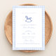 Um belo convite de aniversário de gingham azul com um clássico design de cavalo de balanço, perfeito para celebrar o dia especial de um menino. O estilo elegante e eterno torna-o ideal para o terceiro aniversário ou para qualquer festa de criança, criando uma doce manutenção para a família e os amigos.