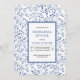 O azul de índigo moderno deixa o convite para janto de ensaio de casamento modelo. Este belo convite mostra um padrão de folhas azuis e seu texto em um quadro branco escalopado com círculos azuis de índigo como contorno.