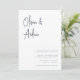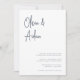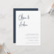 Um belo convite de casamento baseado em tipografia, com seus nomes em letras de escrita manual, azuis e marinho modernas, no topo. Personalize com seus detalhes de casamento em letras clássicas de serif alinhadas no canto inferior direito.