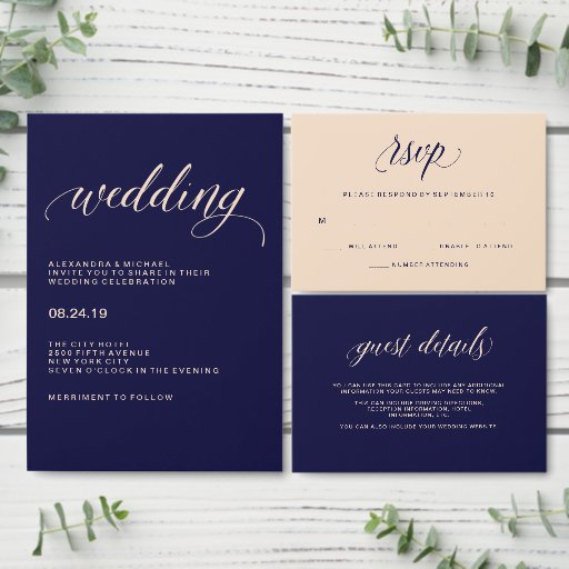 Esses simples e minimalistas cartões de informação de recepção de casamento apresentam caligrafia rosa bege em um fundo azul marinho. Você pode usá-los para incluir qualquer informação de recepção que precise que seus convidados saibam.