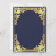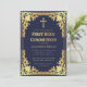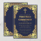 Este convite de primeira comunhão azul-marinho dourado com um ar vintage, recomendado para um menino, tem uma moldura ornamentada em folha de ouro falso com decorações barrocas douradas elegantes sobre um fundo azul-marinho. Acima do texto há uma cruz religiosa em folha de ouro falso. Exceto pela ocasião "Primeira Comunhão", que também está em ouro falso, todo o texto pode ser personalizado e tem uma cor amarela dourada semelhante à moldura de ouro falso.