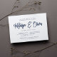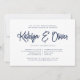 Nosso elegante e moderno janto de ensaio de casamento ou convites de festas de coquetel em azul-marinho-chic e branco apresentam seus nomes em tipografia escrita à mão. Personalize com seu ensaio de cerimônia e ensaie detalhes de janto abaixo. Inclui espaço para a época do ensaio e endereço da igreja ou do local. Cartões invertidos a azul de marinho sólido. Um design de chic em marinho clássico e branco para casais modernos e eventos elegantes.