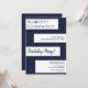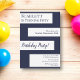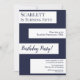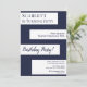 Este convite de aniversário azul marinho e branco é perfeito para um aniversário moderno. o design simples apresenta caligrafia azul marinho elegante em listras brancas sobre um fundo azul marinho.