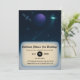 Design de convite para o espaço exterior estilizado com um OVNI azul brilhante, um planeta violeta escuro, satélite e estrelas cintilantes num céu galáxico gradiente. A seção inferior contém texto de evento editável, enquadrado em um painel de cartão brilhante, ideal para festas futuristas ou aniversários com temas de alienígena.