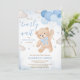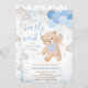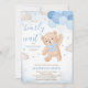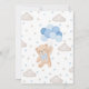 Celebre o seu pequeno com o nosso Blue We Can Barly Wait Chá de fraldas Invitation, com um adorável urso marrom com um arco azul, segurando balões azuis. O fundo está lindamente adornado com nuvens macios e estrelas cintilantes, criando uma atmosfera sonhadora perfeita para celebrar a chegada da sua pequena. BBS650