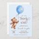 Um ursinho fofinho bonito segurando-se num balão azul. Fontes de estilo manuscrito e caprichoso. Paleta de cores azul e marrom. Use a Ferramenta Editar para selecionar fontes diferentes, alterar a cor do plano de fundo ou redimensionar/reposicionar o urso. © Kimbellish, LLC