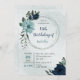 Convite de aniversário único com flores azuis e marinhos românticas empoeiradas e folhas verdes quadro geométrico botânico. PARA MAIS PRODUTOS CORRESPONDENTES, clique na coleção acima ou entre em contato comigo.