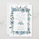 Flores azuis e poeirentas flores de aquarela floral convite para o casamento. Este belo design inclui um quadro floral feito de flores azuis empoeiradas e folhas suculentas verdes e seu texto. Os nomes estão na tipografia de scripts. O dorso é de cor azul sólida.