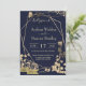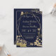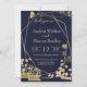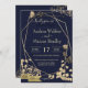 O azul e o bege de champanhe da meia-noite se combinam com quadros geométricos criam um convite moderno e único, mas completamente romântico para seus núpcias. O reverso tem uma trajetória diagonal simples de flocos de ouro (impressos, com aspecto real, mas com trompe l'oeil)